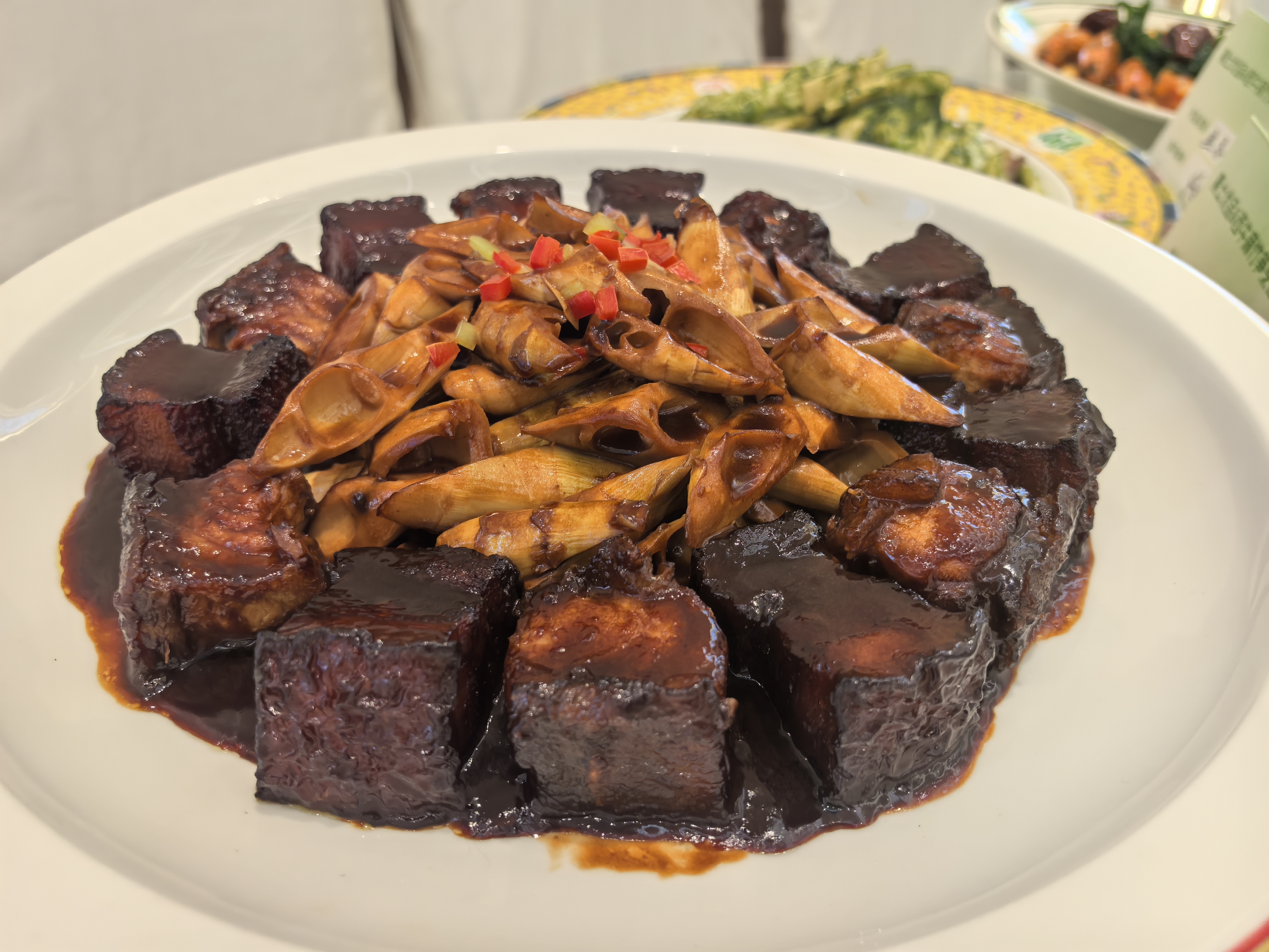 决赛现场,厨师们也循着这一思路各显身手:有的将笋丁与经典的哈尔滨红肠融合,咸香中透着脆嫩;有的让笋丝与粉条、五花肉等一同炖煮,吸饱了汤汁的笋丝滋味十足;更有大胆的创意,将笋片挂糊油炸,烹成酸甜可口的“锅包笋”,或是将鲜嫩笋片放入“小鸡炖蘑菇”等家常名菜中,为浓郁的酱香增添一抹清新的底色。经过激烈角逐和由粤黑两地餐饮专家、美食评论家组成的评审团严格品评,十道创意与风味俱佳的菜品最终脱颖而出,被正式授予“冰雪笋宴金牌菜”称号。