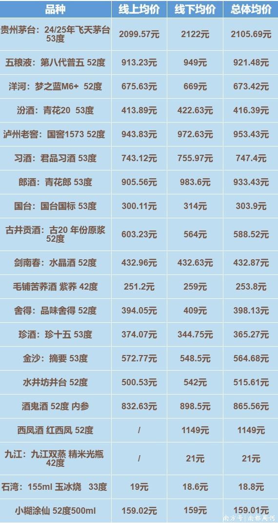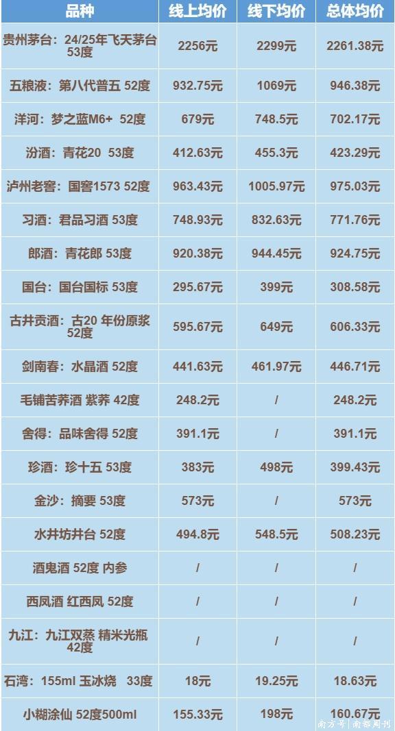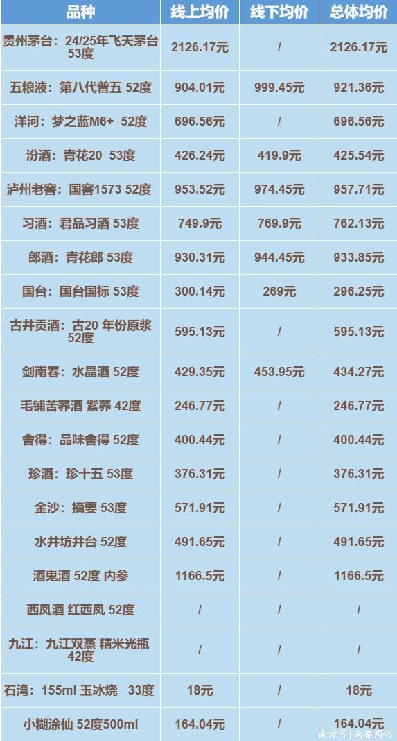 在上一轮《湾区酒价》统计和呈现方式出现了新的调整后,南都湾财社记者在统计过程中注意到,深圳酒水产品的零售均价主要受当地线上终端价格变动影响,而线下终端没有出现过较大变动,因此,线上价格的表现一定程度上可以反映当下深圳市场酒水价格的动态。