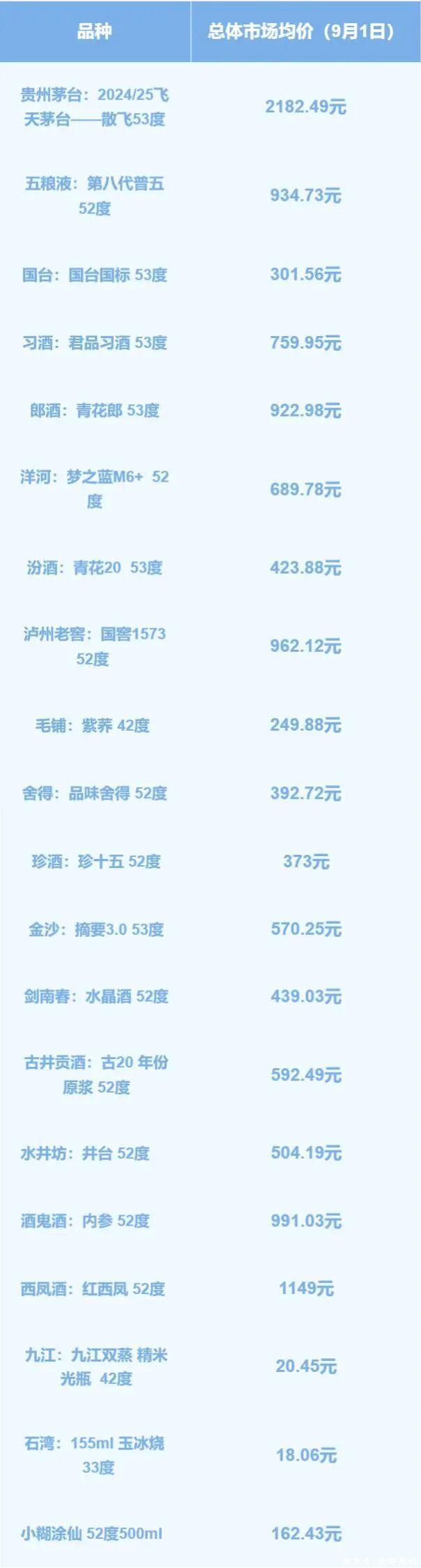 其中,飞天茅台本期的均价约为2106元,比上期减少约28元;第八代五粮液的均价约为921元,比上期减少约23元;国窖1573、君品习酒的均价比上期分别下降4元、29元。 其他千元价格带产品的均价有所上涨,青花郎、酒鬼酒内参、红西凤本期的均价分别上涨17元、44元、25元。